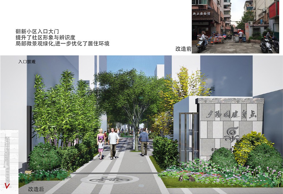 老舊小區(qū)更新改造以提升居民生活品質(zhì)為核心,針對小區(qū)入口破舊、公共設(shè)施不足等問題,進行了全面更新與優(yōu)化。設(shè)計通過翻新小區(qū)入口大門,提升了社區(qū)形象與辨識度;在內(nèi)部道路兩側(cè)增設(shè)花箱座椅,既美化了環(huán)境,又提供了休憩空間;新增的兒童游樂設(shè)施和老年人活動設(shè)施,滿足了不同年齡段居民的需求,增強了社區(qū)活力;公共座椅與局部微景觀綠化的布置,進一步優(yōu)化了居住環(huán)境,營造了舒適宜人的公共空間。改造注重功能性與美觀性相結(jié)合,既解決了原有設(shè)施的陳舊問題,又注入了人文關(guān)懷,為居民打造了一個更加宜居、和諧的社區(qū)環(huán)境,提升了居民的幸福感與歸屬感。